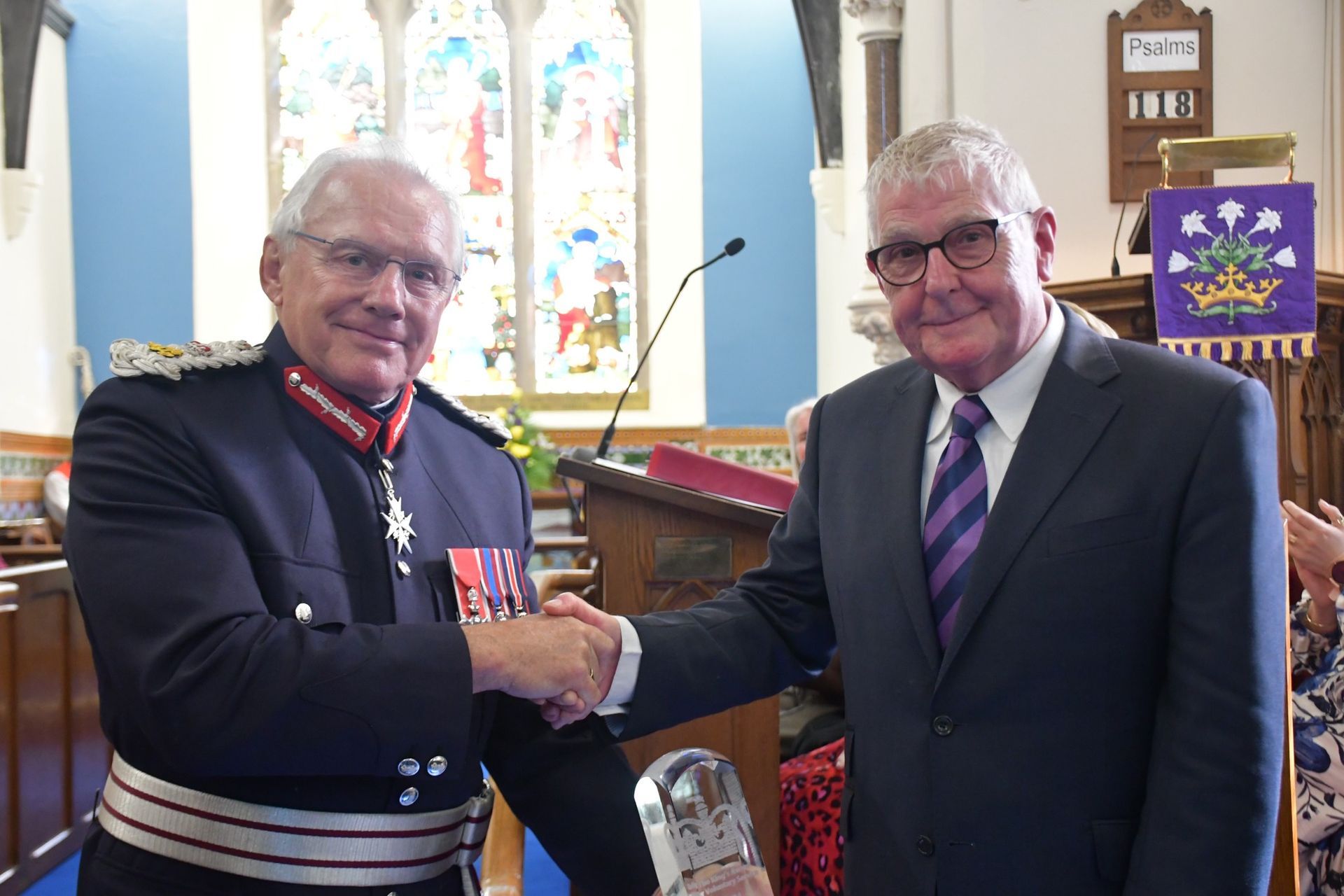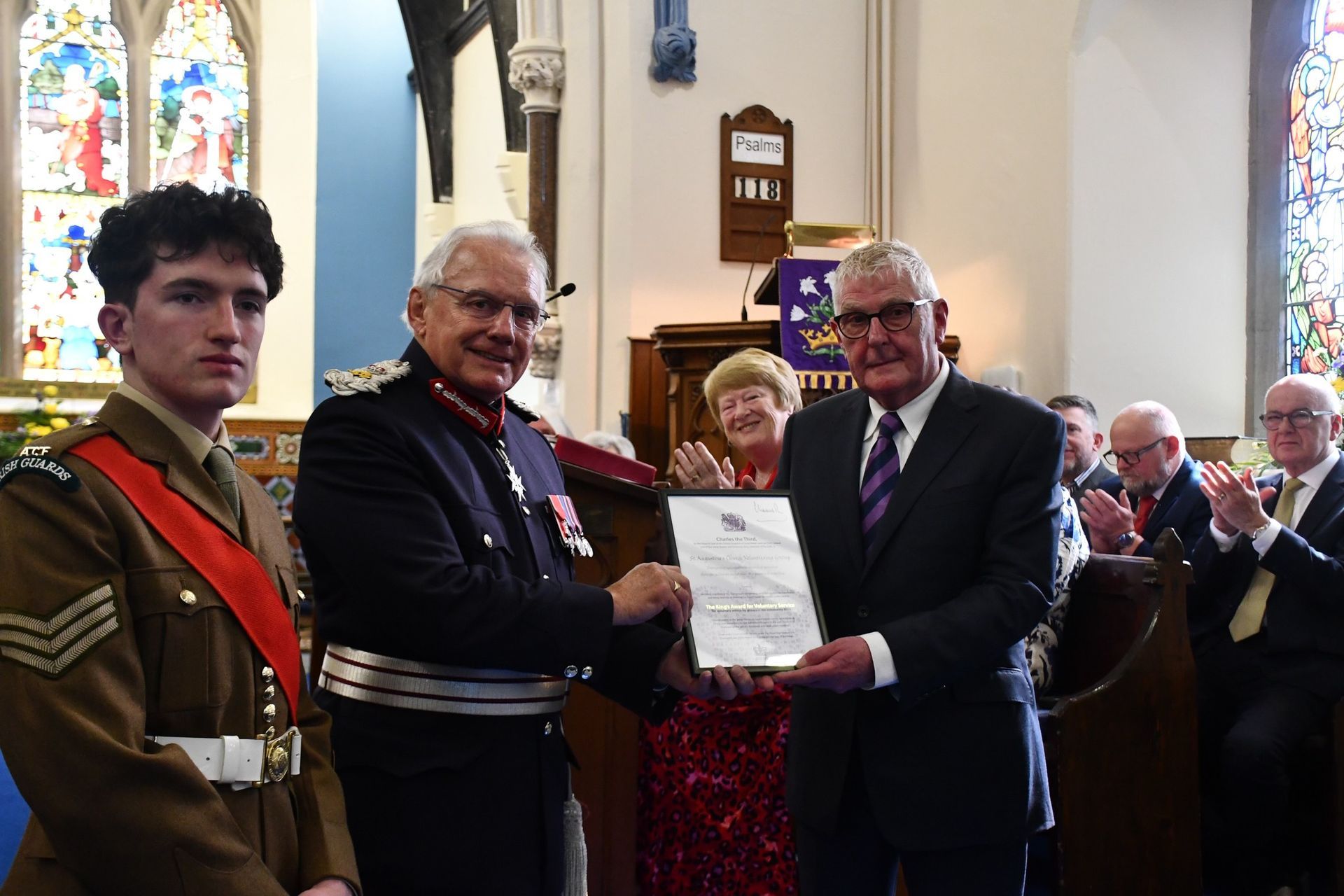 Civic dignitaries joined parishioners, volunteers and friends of St Augustine's Church in Londonderry, on Palm Sunday, to see the King's Lord Lieutenant for the County Borough of Londonderry, Ian Crowe M.B.E., present a King's Award for Voluntary Service to the church's volunteering group. The team were recognised for “overcoming isolation and extending welcome through inclusion and events at a polarised interface”. Equivalent to an MBE, KAVS is the highest Award given to local voluntary groups in the UK, and they are awarded for life. The presentation was made by the Lord Lieutenant to parishioner Ivan Taylor during the Morning Service, which was led by the Rector, Rev Nigel Cairns. "In my view," the Rector told the congregation, "this award recognises all the community-facing volunteering that takes place from here. And it doesn't only honour current work. It's also testimony to the decades of volunteering that has gone on, and we very much stand on the shoulders of those who have gone before us in this important work."