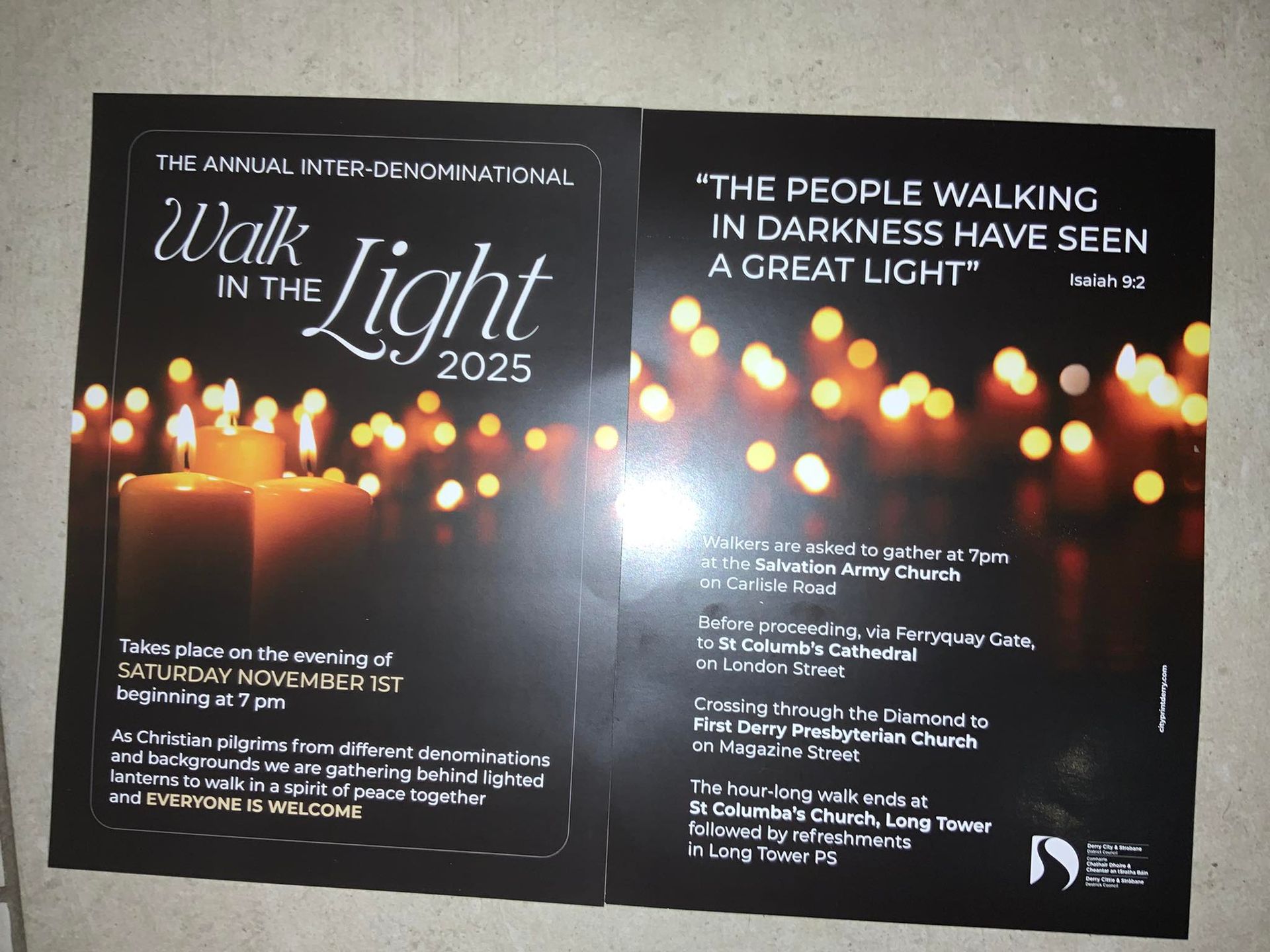 The Annual Inter Denominational ' Walk in the Light" event takes place on Saturday 1st November 2025 beginning at 7pm.